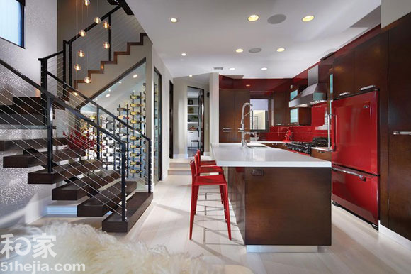 楼梯下方空间用玻璃房隔开,通透的玻璃让红酒跳跃而出又保持相对的独立性。墙面上的酒柜合理规划,收藏的美酒置于其上,站在它们面前,摇晃着高脚杯,边欣赏这些富含品味的“装饰”,边享受舌尖上味蕾不断散发出的幸福感。