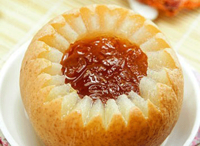 5.把刚才切出的雪梨蒂部盖到雪梨盅上,这样是为了防止在蒸燕窝的过程中,蒸锅内的蒸汤会滴到燕窝中,影响味道。蒸锅水烧开,把加盖的燕窝雪梨盅放到,蒸锅中。隔水以文火炖1—2个小时