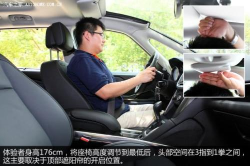 空间表现方面,身高176cm的体验者坐入其中并将座椅高度调节到最低位置时,头部空间约有3指到1拳之间,表现还算不错。此时进入后排,头部空间大约只有1指左右,略显局促。当第二排座椅在最靠后位置时,腿部空间有3拳上下,当拉到最靠前的时候,空间还有三指左右。不过,其第二排座椅无论座垫还是靠背都比较硬,乘坐舒适性比前排差不少。