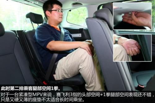 至于第三排,赛飞利的表现勉强还算可以接受,当第二排乘客把腿部空间控制在1拳左右时,第三排乘客的腿部大约有1拳,头部有3指。空间对于一台紧凑型MPV还算说得过去,但舒适性很一般,椅垫太薄、太硬。