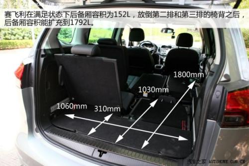 相比于不太舒适的第二和第三排,赛飞利的后备厢表现倒是还不错,在不放到第三排座椅的情况下,后备厢纵深仍有310mm,放两个登机箱毫无压力,当放倒第三排座椅椅背后能获得1030mm的纵深。而将第二排座椅椅背放倒后,该车能获得的最多纵深为1800mm,就算搬个自行车、滑雪板都毫无压力。