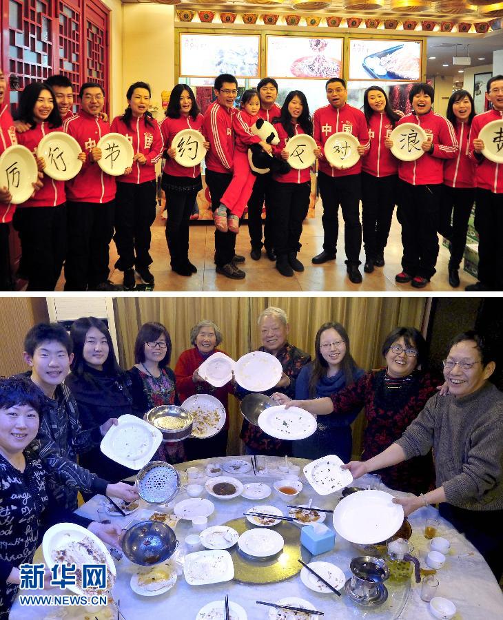 这张拼版照片显示的是:“光盘行动”的志愿者手拿餐盘喊出“厉行节约,反对浪费”的口号(上图,1月27日摄);北京石景山区一饭店,胡玉兰大妈(左五)一大家人吃过年夜饭后展示空盘空碗(下图,2月9日摄)。2013年,由志愿者提出的“光盘行动”引发社会强烈反响,越来越多的人行动起来成为拒绝“剩宴”的“光盘族”。
