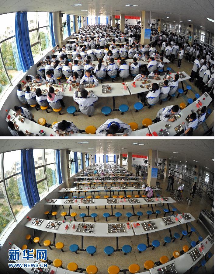 这张拼版照片显示的是:11月20日,湖南省浏阳市一中的学生在自助食堂用餐(上图);学生们用餐完毕后的餐具和残渣碟(下图)。据介绍,该自助食堂一餐有800多人用餐,而餐后泔水加起来装不满一个普通塑料桶,“文明用餐、节俭惜福”已经成为了这里的校园食堂文化。