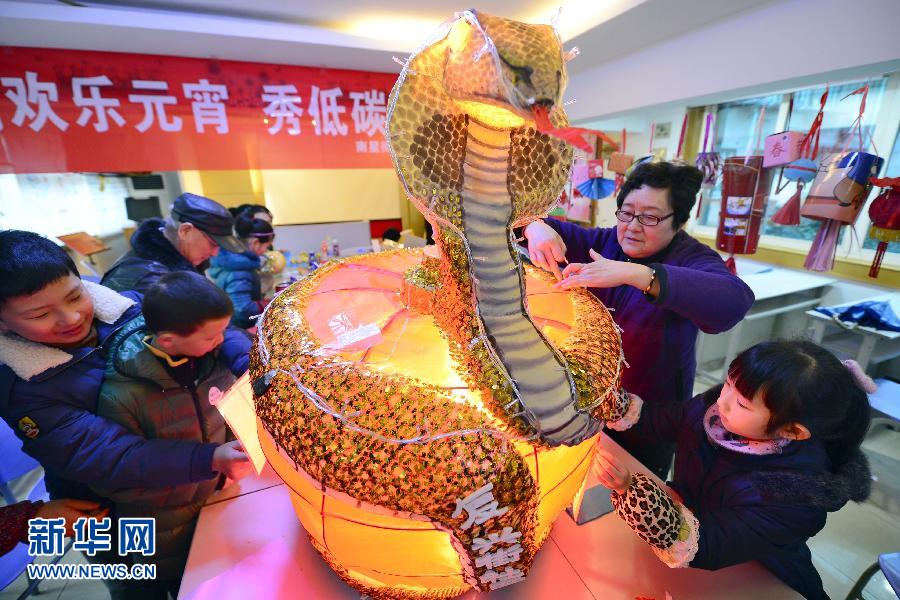 浙江杭州一社区的居民和孩子们一起用旧灯笼、碎布料等材料制作“金蛇盘灯”,迎接蛇年元宵佳节(2月18日摄)。