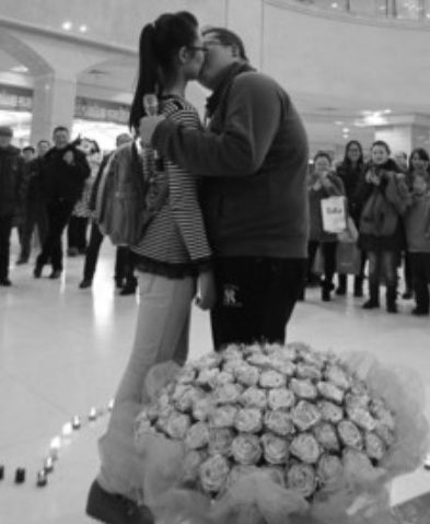 昨日,一个胖小伙在沈阳某大型商场举行的接吻比赛场地向女友求婚,却惹得女友皱眉撅嘴。