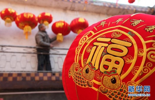 12月30日,在河南省焦作市武陟县西陶镇东滑封村“廉火灯笼”作坊,村民在晾晒大红灯笼。