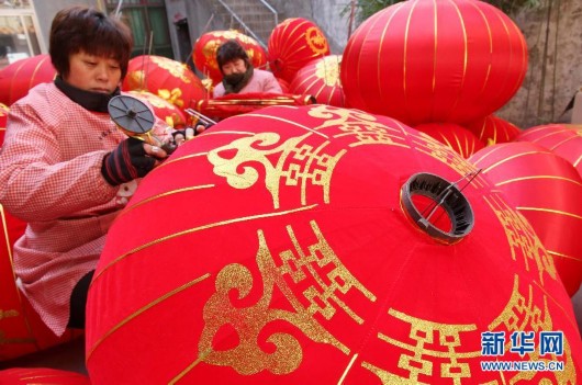 12月30日,在河南省焦作市武陟县西陶镇东滑封村“廉火灯笼”作坊,村民在制作大红灯笼。