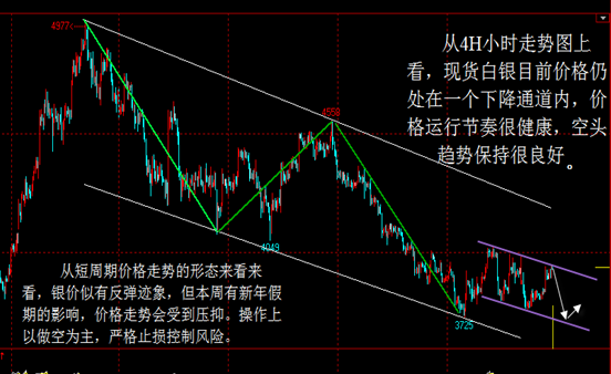 粤贵银上周同样趋于平淡,受圣诞假期的影响。从月线来看,本月还剩最后两个交易日,月线呈现一根小阳十字星,在接下来的两个交易日中,使得月线的收线格局充满着一定悬念。综合来看,本年度银价自6000水平位承压回落,一度刷新近三年新低至3620元/千克,在本年度仅剩最后两个交易日的同时,收阴已成定局。从4H小时走势图上看,现货白银目前价格仍处在一个下降通道内,价格运行节奏很健康,空头趋势保持很良好,从短周期价格走势的形态来看来看,银价似有反弹迹象,但本周有新年假期的影响,价格走势会受到压抑。