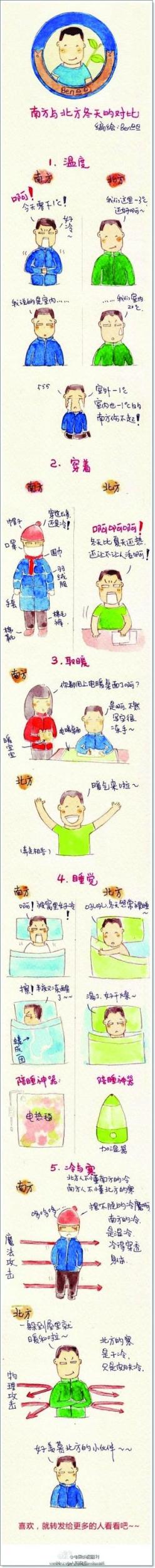 漫画中,“@Ben旦旦”首先从温度来看,北方的室外温度是-3℃时,只要躲进20℃的室内就能保证暖暖的;而在南方,室内外温度一样冷,都是-1℃。穿着上,不管南方人穿多少,都冷得直哆嗦;而在室内的北方人,穿着短袖都觉得热。在取暖方面,在没有暖气的南方,得靠着暖宝宝、电暖桌面等装备才能得以取暖;睡觉时,南方人蜷成一团还是经常被冻醒,而北方人不仅照常裸睡,还被热气折腾得又干又渴。南方人的陪睡神器是电热毯,北方人则只需要加湿器。