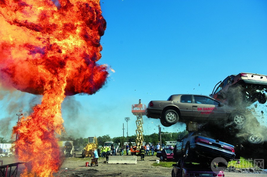爱荷华州,美国|乔尔?萨尔托雷(JOEL SARTORE)|不会有比撞车比赛中猛烈的碰撞和扭曲的废铜烂铁更加会让人看得血脉喷张的了。特技驾驶员驾驶着自己的汽车以60英里每小时(97公里每小时的速度)穿越布满火焰的坡道从50英尺高(15米)的废旧汽车堆一跃而过。