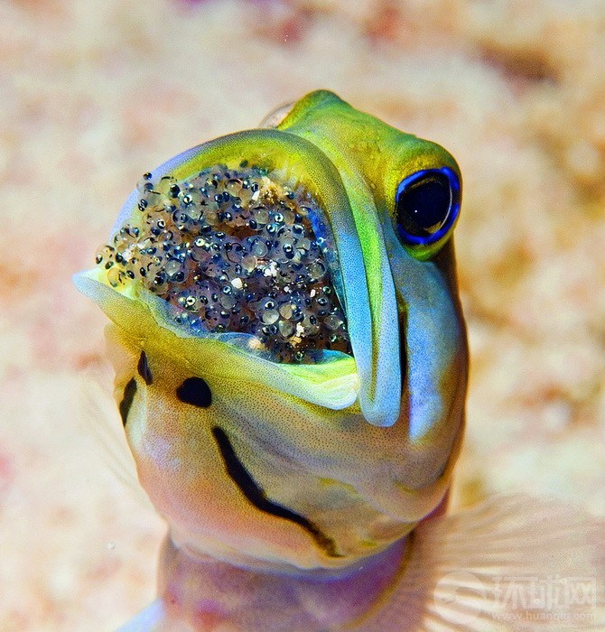 开曼群岛|吉姆?钱伯斯(Jim Chambers)|雄大颚鱼含着满嘴鱼卵把后代孵化在小开曼岛上。大颚鱼的这种生殖技术被称为嘴孵,允许父辈大颚鱼保留鱼卵在身边,便于保护和转移。