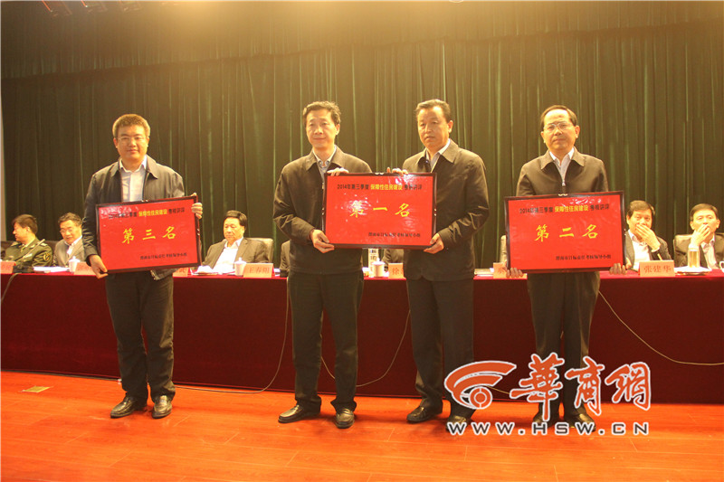 下午4时许,通过渭南市考核办对全市13个县市区的第三季度固定资产投资与重点建设、财税工作、住房保障工作、安全生产、小城镇建设及环境保护六方面的工作考核,评选出各自项目中的前三名和最后一名,分别为其颁发红牌和黄牌。
