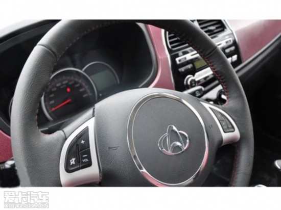 内饰方面,实车图上的车型采用了黑、粉双色配色,整体感觉很时尚,应该能吸引不少年轻女生的目光。该车采用三幅式多功能方向盘,整个内饰面板都很俏皮,黑粉相间,非常可爱。