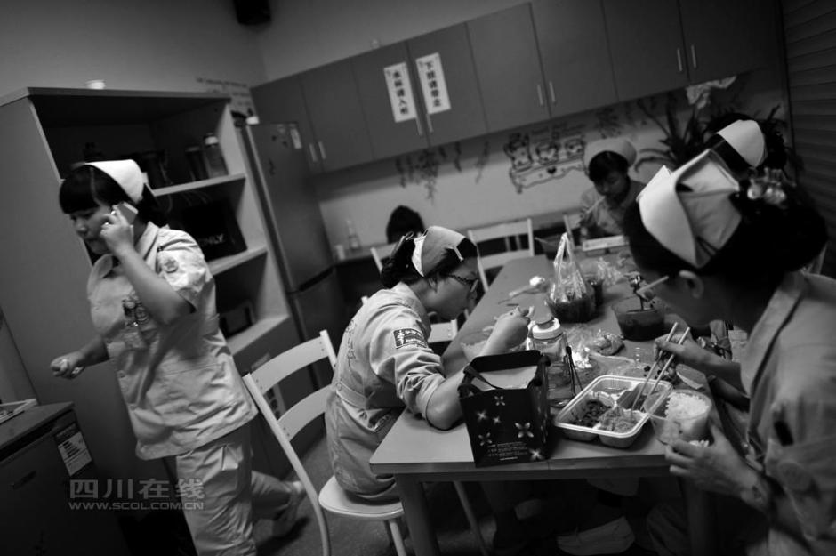 每天吃饭钟点就挤在休息室里轮流就餐。来源:四川在线