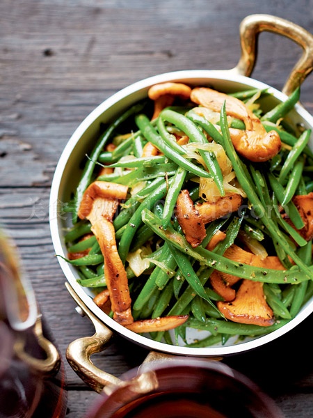 453克扁豆· 345克无盐黄油,切块· 2汤匙初榨橄榄油· 453克鸡油菌,纵向切开· 3个中等大小的红葱头,切成细丝·2茶匙盐渍香草(做法见97页)或盐