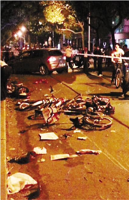 现场歪歪扭扭倒着2辆自行车,2辆完全碎掉的电瓶车,随地可见车祸造成的碎渣,自行车轮胎、伤者的衣物、被压扁的鞋子,还有一个汽车的保险杠,上面还带着浙BF85xx的牌照,路面上还有几摊血迹。