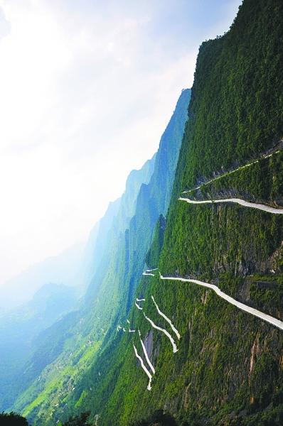 它全长10.77公里,从标志门直达天门洞脚下,海拔从200米急剧提升至1300米,共有九十九个弯。