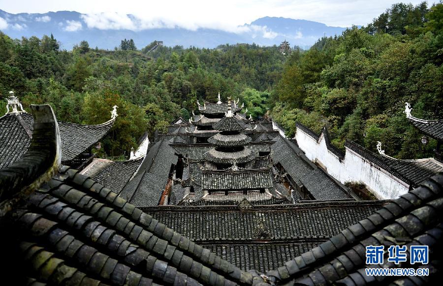 11月2日拍摄的湖北恩施“九进堂”土司庄园。湖北省恩施土家族苗族自治州土司城里的“九进堂”土司庄园,是土家族干栏式吊脚楼仿古建筑群落。将传统的土家吊脚楼、摆手堂、官言堂、书院及月台、戏楼等融为一体的“九进堂”,总高99.9米,宽29.9米,呈纵向层台递进式布局,全部建筑构件中,有303个柱础(恩施称磉墩),330道门,90个窗户,全由榫铆相接的木结构组成。总建筑面积4300平方米。是土家族地区土司文化标志性工程。新华社发(宋文摄)