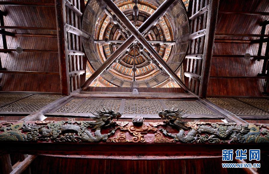11月2日拍摄的湖北恩施“九进堂”土司庄园从下往上看的屋顶。湖北省恩施土家族苗族自治州土司城里的“九进堂”土司庄园,是土家族干栏式吊脚楼仿古建筑群落。将传统的土家吊脚楼、摆手堂、官言堂、书院及月台、戏楼等融为一体的“九进堂”,总高99.9米,宽29.9米,呈纵向层台递进式布局,全部建筑构件中,有303个柱础(恩施称磉墩),330道门,90个窗户,全由榫铆相接的木结构组成。总建筑面积4300平方米。是土家族地区土司文化标志性工程。新华社发(宋文摄)