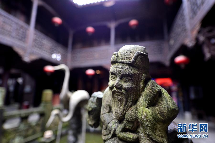 11月2日拍摄的湖北恩施“九进堂”土司庄园四合园内的雕塑。湖北省恩施土家族苗族自治州土司城里的“九进堂”土司庄园,是土家族干栏式吊脚楼仿古建筑群落。将传统的土家吊脚楼、摆手堂、官言堂、书院及月台、戏楼等融为一体的“九进堂”,总高99.9米,宽29.9米,呈纵向层台递进式布局,全部建筑构件中,有303个柱础(恩施称磉墩),330道门,90个窗户,全由榫铆相接的木结构组成。总建筑面积4300平方米。是土家族地区土司文化标志性工程。新华社发(宋文摄)