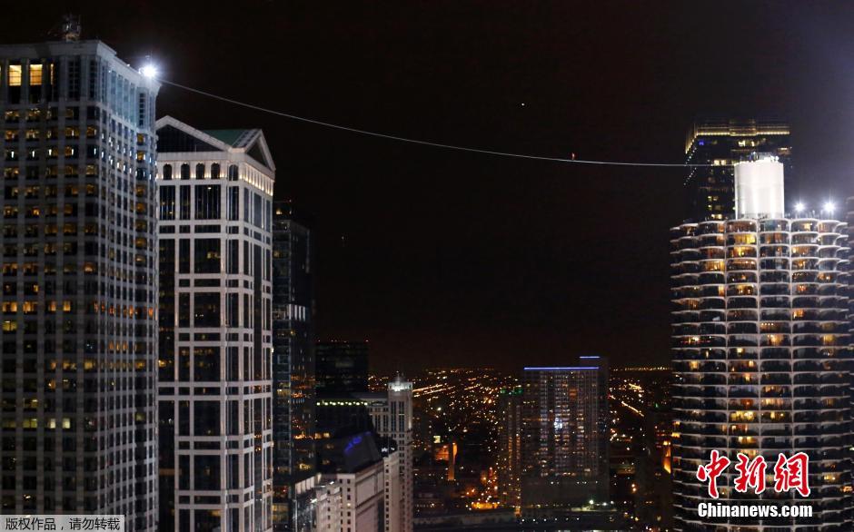 当地时间11月2日,号称“不拍死的尼克华伦”在芝加哥开始了新一轮的挑战,在152.4米的高空穿行两座摩天大楼之间。