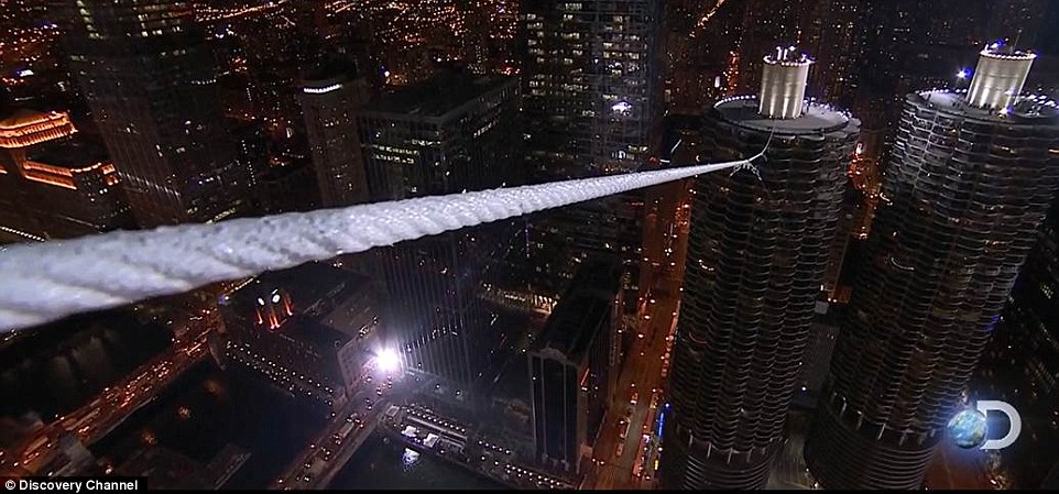 据英国《每日邮报》11月2日报道,号称“不拍死的尼克华伦”在芝加哥开始了新一轮的挑战,在152.4米的高空穿行两座摩天大楼之间。(网页截图)
