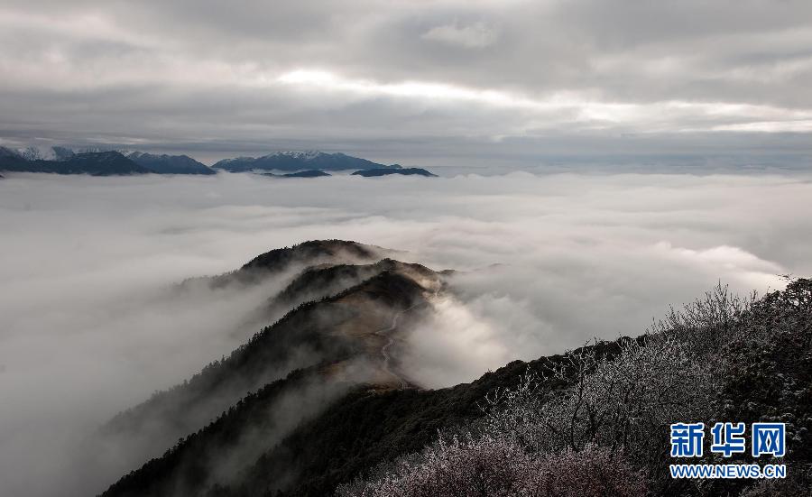 达瓦更扎的云海(11月1日摄)。四川省宝兴县硗碛藏族乡嘎日村境内的达瓦更扎(“达瓦更扎”为嘉绒藏语,意为“美丽的神山”),海拔约3900米,面积近200平方公里,属于邛崃山脉,地势北高南低,在四川省雅安市、甘孜州以及阿坝州的交界处。今年10月,宝兴县嘎日村为帮助当地藏民发展牧业修建的一条24公里的“通天路”建成通车。该路尽头地势陡险,视野开阔,既可环顾北面的四姑娘山、南面的帕格拉神山、西面的贡嘎群峰等名山,也可观赏云瀑、草甸、森林、湖泊、峡谷、藏寨等各类景观。新华社记者江宏景摄