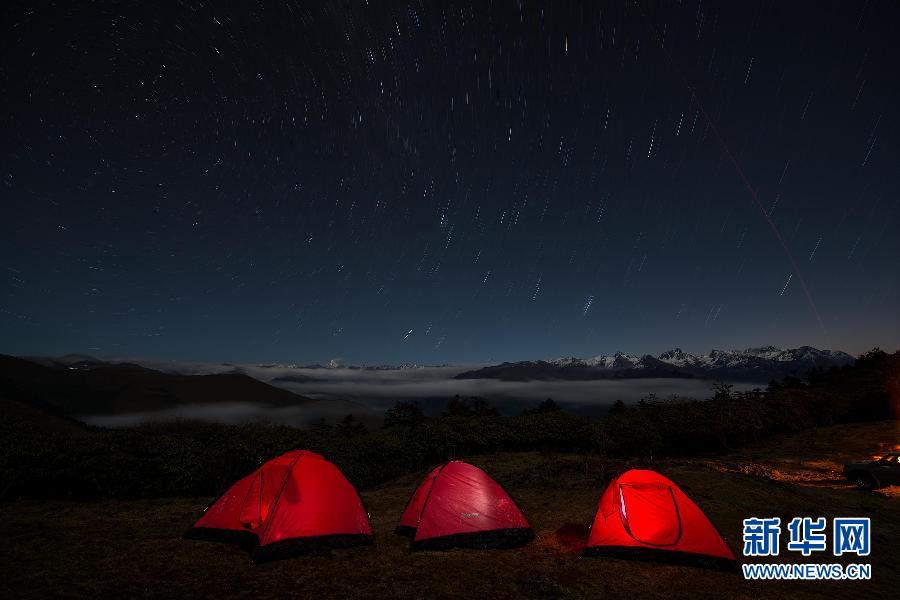 达瓦更扎上的星空(11月1日摄)。四川省宝兴县硗碛藏族乡嘎日村境内的达瓦更扎(“达瓦更扎”为嘉绒藏语,意为“美丽的神山”),海拔约3900米,面积近200平方公里,属于邛崃山脉,地势北高南低,在四川省雅安市、甘孜州以及阿坝州的交界处。今年10月,宝兴县嘎日村为帮助当地藏民发展牧业修建的一条24公里的“通天路”建成通车。该路尽头地势陡险,视野开阔,既可环顾北面的四姑娘山、南面的帕格拉神山、西面的贡嘎群峰等名山,也可观赏云瀑、草甸、森林、湖泊、峡谷、藏寨等各类景观。新华社记者江宏景摄