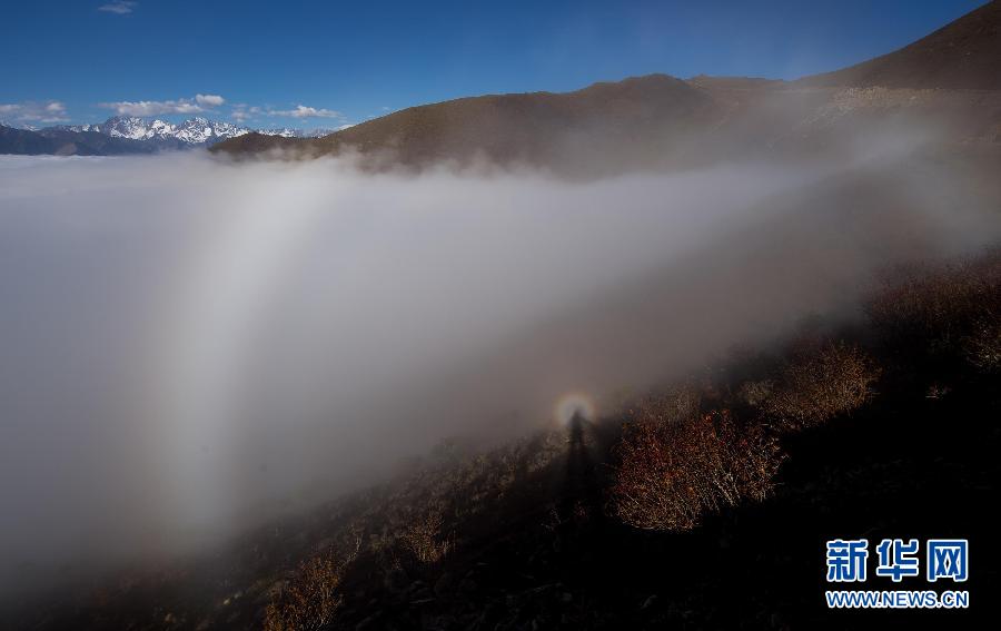 达瓦更扎出现“佛光”景观(11月4日摄)。四川省宝兴县硗碛藏族乡嘎日村境内的达瓦更扎(“达瓦更扎”为嘉绒藏语,意为“美丽的神山”),海拔约3900米,面积近200平方公里,属于邛崃山脉,地势北高南低,在四川省雅安市、甘孜州以及阿坝州的交界处。今年10月,宝兴县嘎日村为帮助当地藏民发展牧业修建的一条24公里的“通天路”建成通车。该路尽头地势陡险,视野开阔,既可环顾北面的四姑娘山、南面的帕格拉神山、西面的贡嘎群峰等名山,也可观赏云瀑、草甸、森林、湖泊、峡谷、藏寨等各类景观。新华社记者江宏景摄