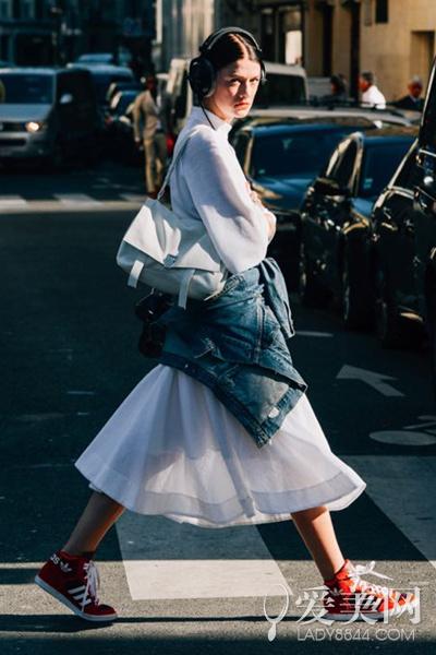 搭配要点:白色上衣+白色透视半身裙+红色运动鞋+牛仔外套+白色单肩包