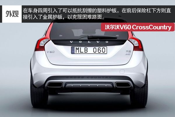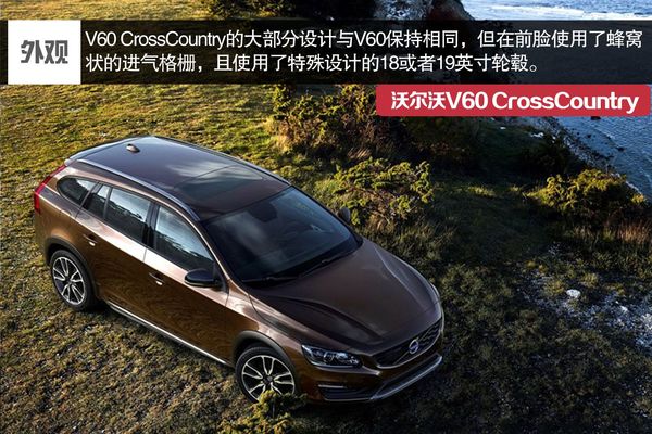 V60CrossCountry的大部分设计与V60保持相同,但在前脸使用了蜂窝状的进气格栅,用于紧急辅助制动和主动巡航系统的雷达护板造型也有所改变,且使用了特殊设计的18或者19英寸轮毂。