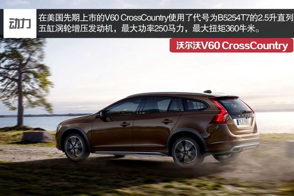 在美国先期上市的V60CrossCountry使用了代号为B5254T7的2.5升直列五缸涡轮增压发动机,最大功率250马力(186千瓦),最大扭矩360牛米。通过一个6前速自动变速器和Haldex瀚德中央差速器驱动四个车轮。
