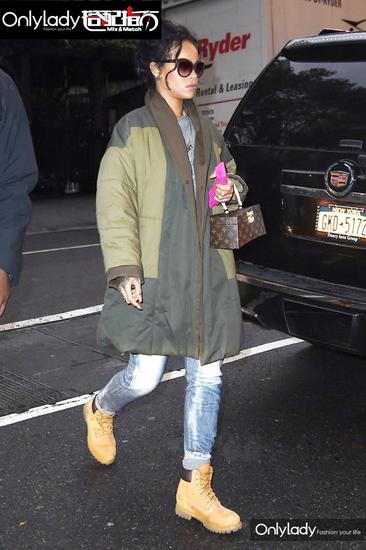 整体的造型如果放在男生身上都不足为过,丹宁牛仔裤配登山鞋Rihanna经常会这么穿,全身的亮点在于细节处理,精致的手包可以将粗犷的视觉感减弱又不失味道,这种都市冒险风,是一种新的尝试。