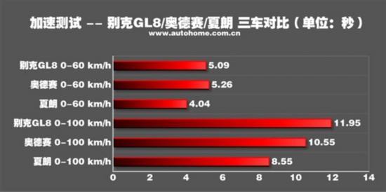 在0-100km/h加速测试中,夏朗以8.55秒的成绩拿到了第一名,而奥德赛的表现也很令人满意,比参数极为接近的GL8快了1.4秒,影响GL8加速成绩的最大问题还是变速箱,这台6速手自一体变速箱的换挡较慢,所以导致了加速时间较长。