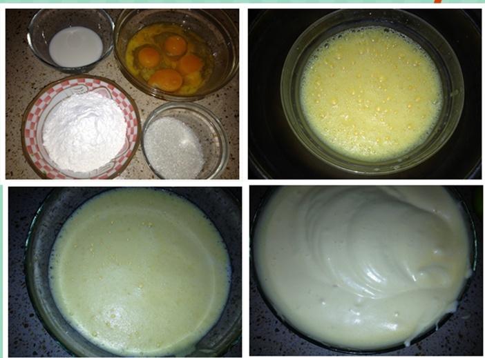 6、用翻拌的方法将低粉翻拌入蛋糊里,直到看不到低粉。然后加入加热后的牛奶继续翻拌,直到面糊可以像缎带般落下就可以了。