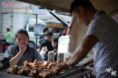 一位女孩在“八戒烤蹄”烧烤摊前等她点的烤猪蹄。她说,网上很多人都说“烤蹄哥”烤的猪蹄味道好,她今天特定过来购买,尝尝味道。