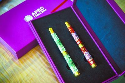 不久前结束的APEC领导人非正式会议上,每位经济体领导人都拿到了一个开会用的公文包,其中一套两支装、和APEC领导人礼品景泰蓝瓶相映成趣的国产景泰蓝笔分外亮眼。这是由北京工美集团专门为2014年APEC会议各经济体领导人特别定制的工艺笔。