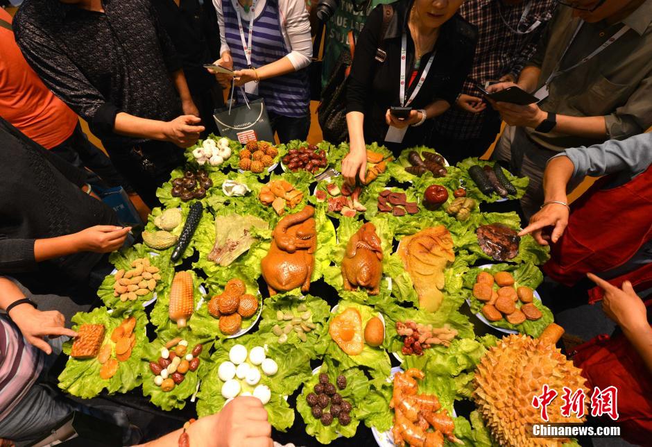 11月23日,在厦门举行的一展会上,一桌由酷似食物菜肴的奇石组成的“满汉全席”让许多前来观赏的市民们真假难辨。中新社发张斌摄