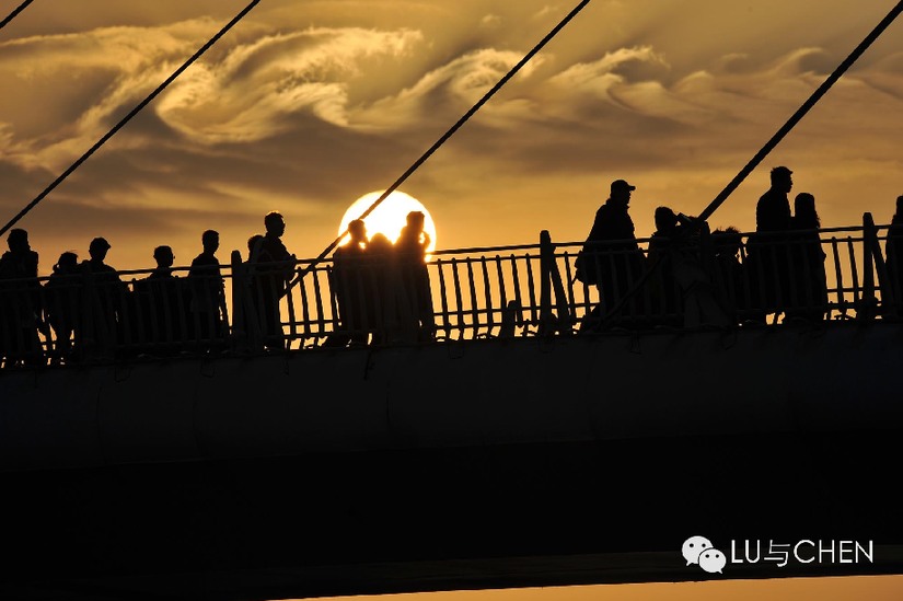 夕阳西下,情侣们在淡水桥看风景。