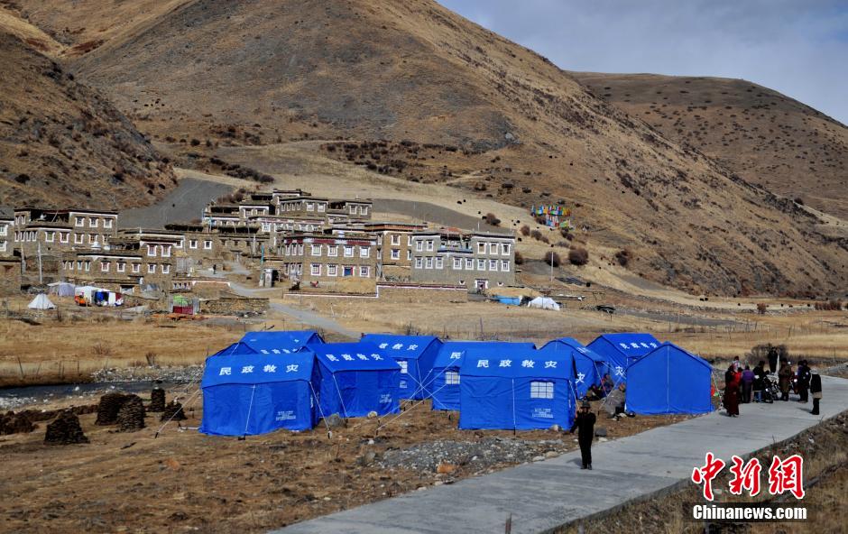 11月24日,康定震灾区江巴村受灾民众已搬进搭建的棉帐篷。四川康定6.3级地震发生后,中国国家民政部、四川省、甘孜州紧急向康定震灾区调拨救灾物资,一些企业也纷纷伸出援手,大批棉被、棉衣和藏毯、棉帐篷、矿泉水、方便食品等救灾物资先后运抵灾区,并分发到受灾民众手中。中新社发刘忠俊摄