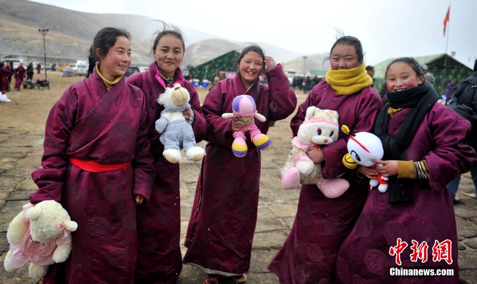 11月24日,康定震灾区孩子们收到爱心布偶。当日,成都小学生捐赠的300爱心布偶以及康定机场捐赠的救灾物资运抵康定机场,机场组织车辆迅速送到位于震中的祖庆学校,志愿者们及时分发给了孩子们,收到爱心布偶孩子们的脸上露出灿烂笑容。中新社发刘忠俊摄