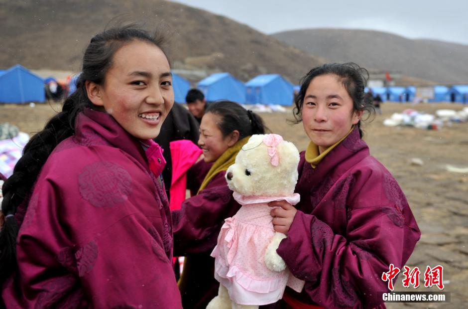 11月24日,康定震灾区孩子们收到爱心布偶。当日,成都小学生捐赠的300爱心布偶以及康定机场捐赠的救灾物资运抵康定机场,机场组织车辆迅速送到位于震中的祖庆学校,志愿者们及时分发给了孩子们,收到爱心布偶孩子们的脸上露出灿烂笑容。中新社发刘忠俊摄