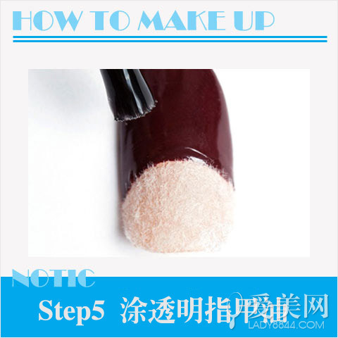 接着在酒红色部分涂透明指甲油,小心不要沾到浅色部分。