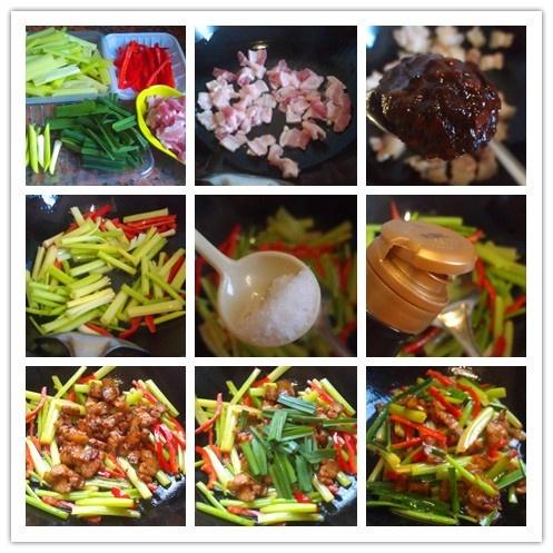 1、五花肉切薄片,香芹,香蒜,红椒均切条备用。