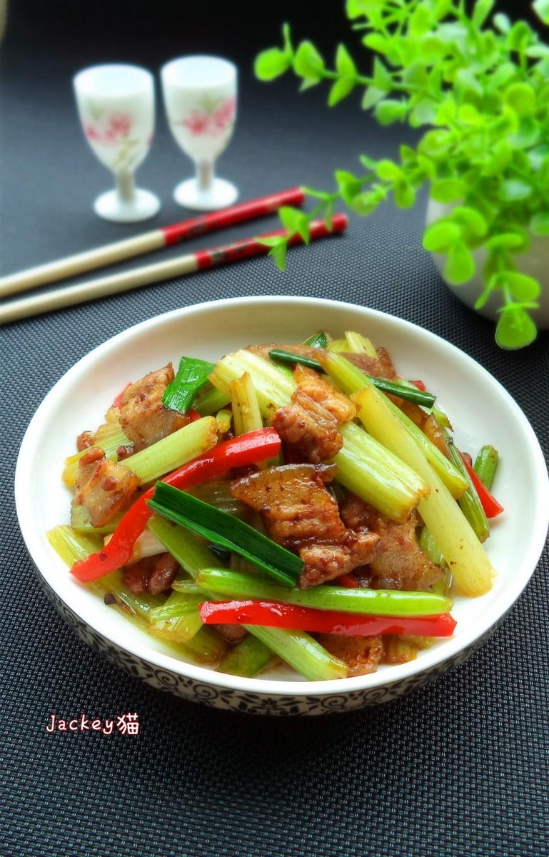 3、翻炒香芹与红椒时,不要过份炒,一变色即断生,此时加入事先炒过的肉片翻炒即可,吃的就是香芹那脆嫩劲不是。