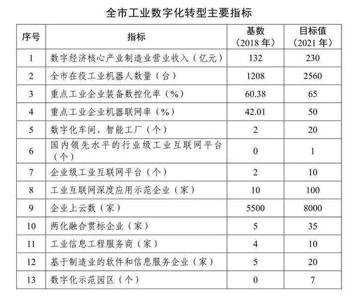 到2021年,全市数字经济核心产业制造业营业收入超过 230 亿元,力争达到260亿元,较2018年翻一番。培育数字化转型试点示范企业300家建成示范企业100家实施数字化转型试点示范项目300个建成示范项目100个累计实现8000家企业上云力争规上企业数字化改造全覆盖
